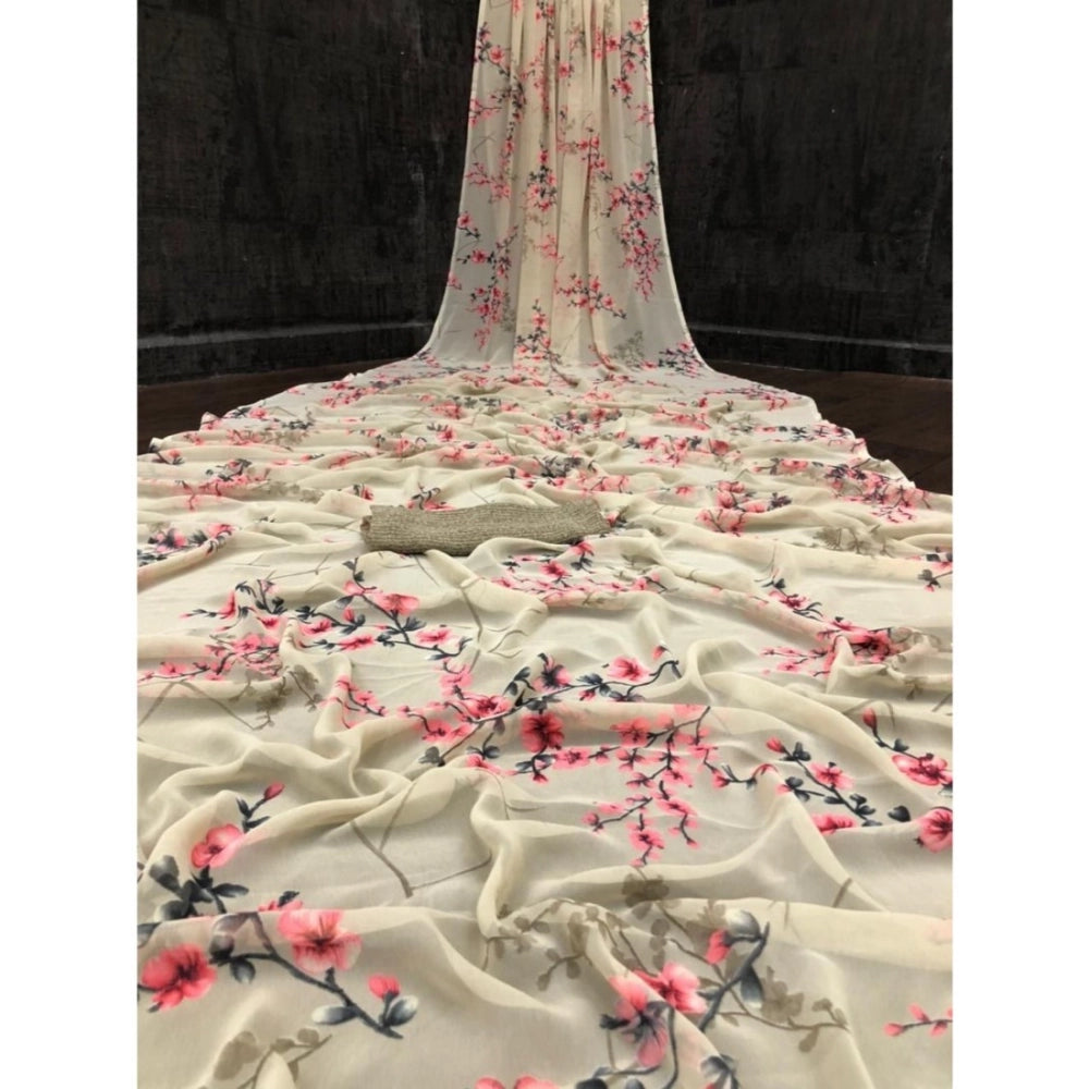 Generic Women's Georgette Printed Saree With Unstitched Blouse (Offwhite)