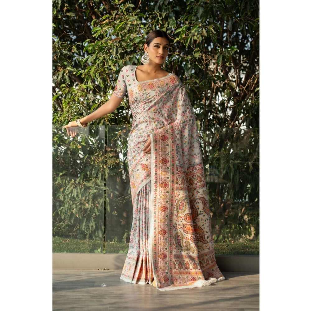 Generic Women's Linen Printed Saree With Unstitched Blouse (Off-White, 5-6 Mtrs)
