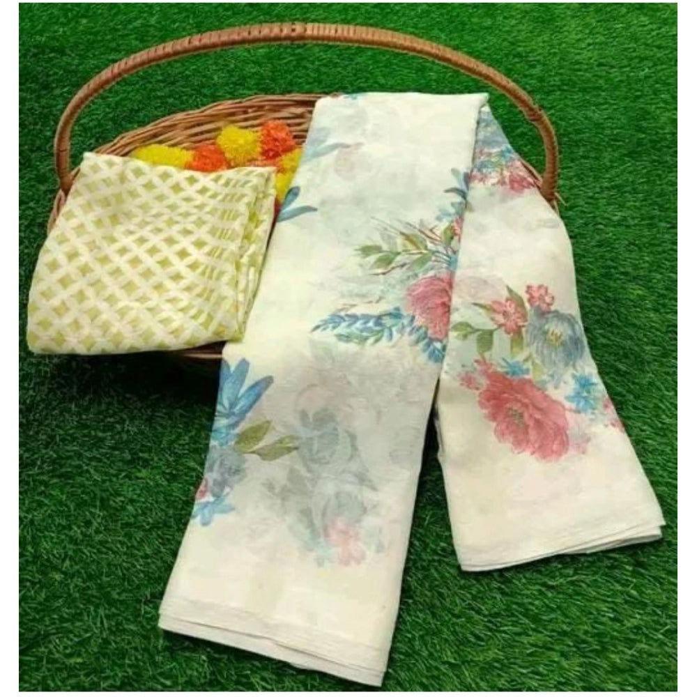 Generic Women's Viscose Rayon Printed Saree With Unstitched Blouse (Cream)